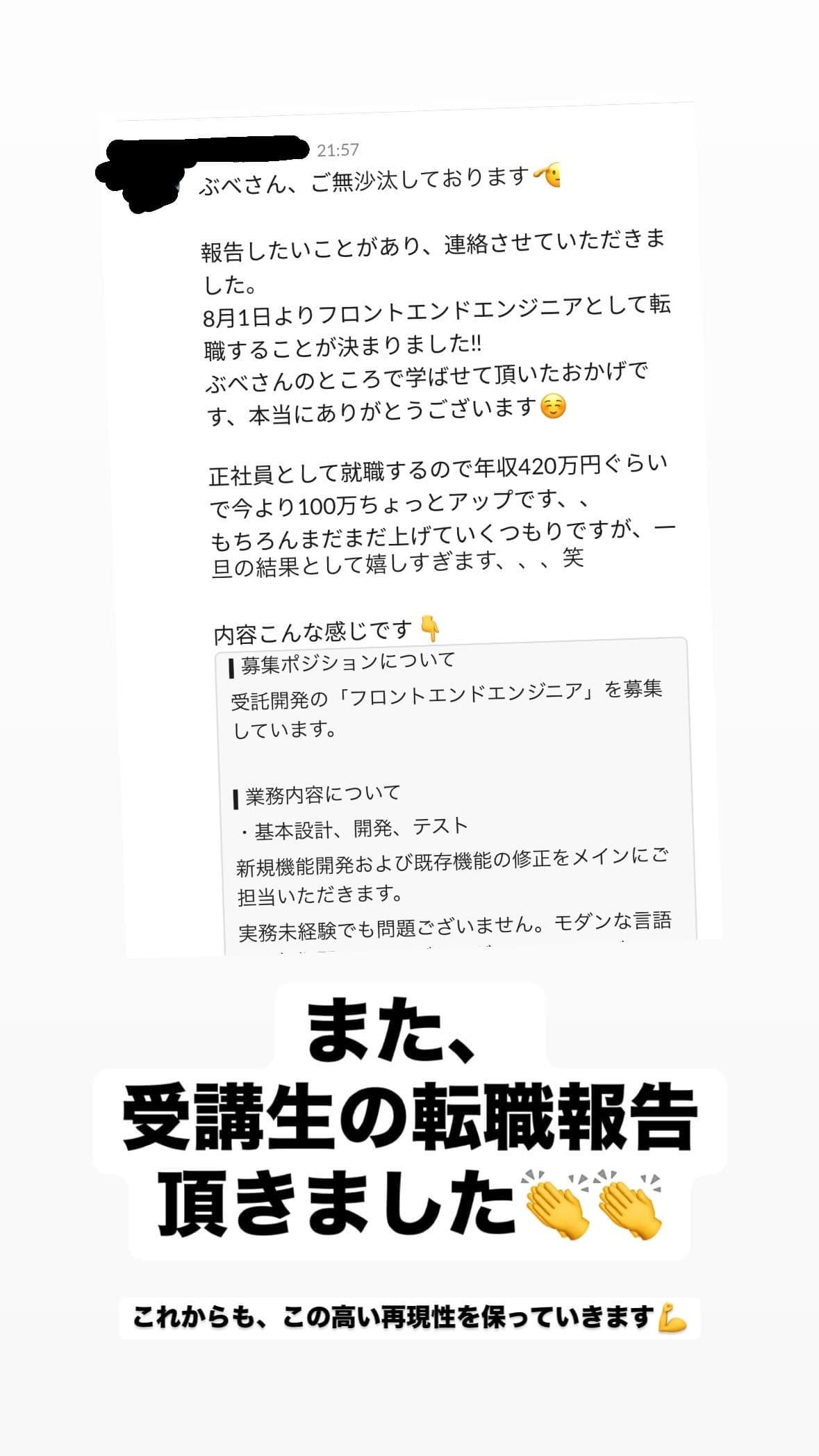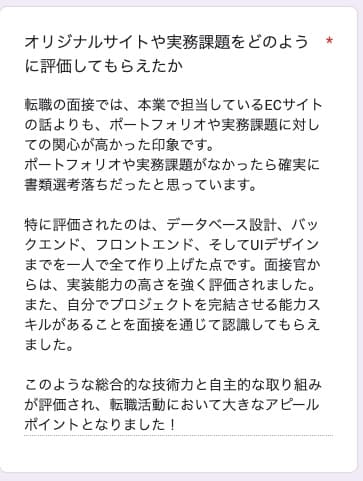 職場がレガシー技術で将来を考え受講。完走後、受託企業へ転職し年収250万円UP